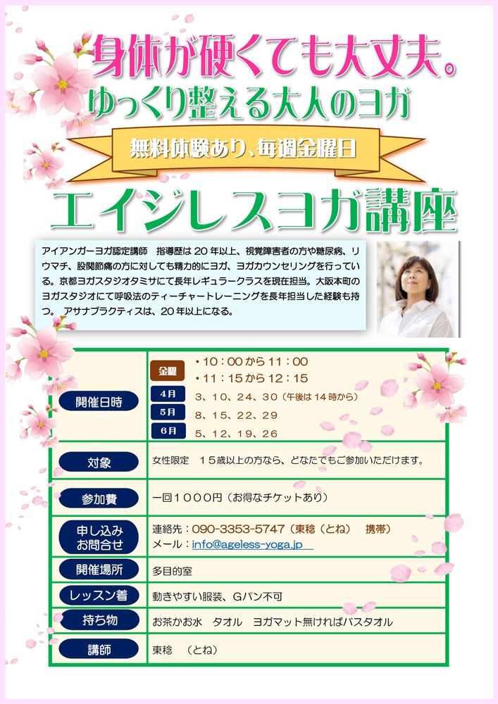 鴫野で習いはじめて、6年位になります。シニアの多いクラスですから、時々トンチンカンな事になります。そんな時でも、英先生のユーモアのヘルプで、大笑いに変わります!ポーズのできる人も苦手なひとも、無理なく、ゆっくりとヨガを楽しんでいます。